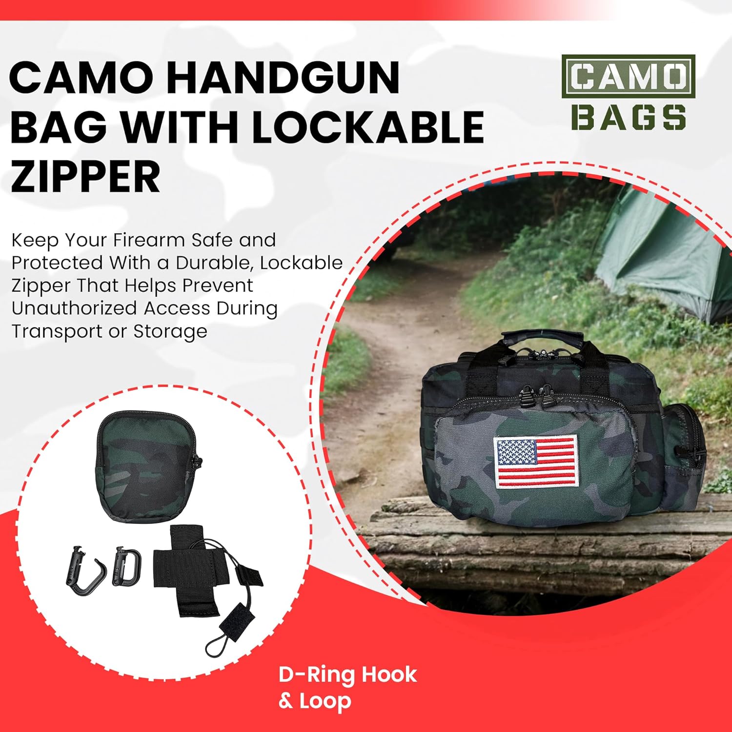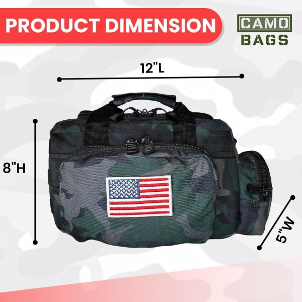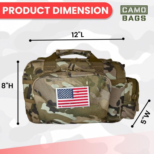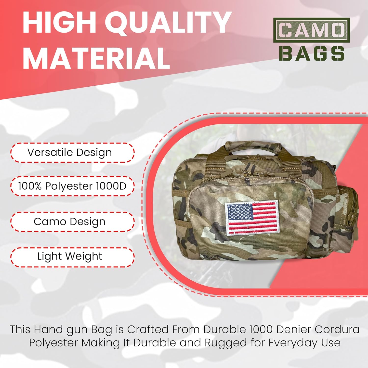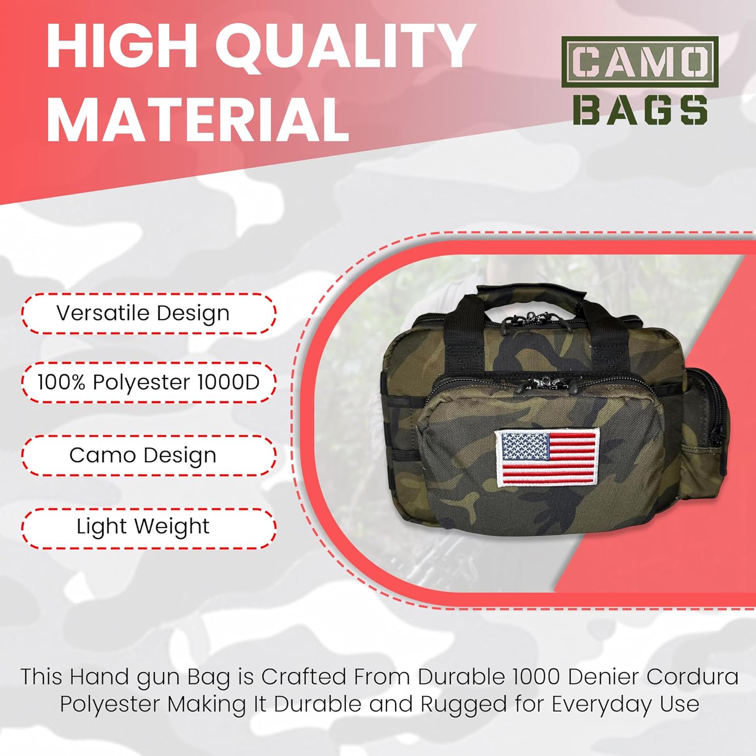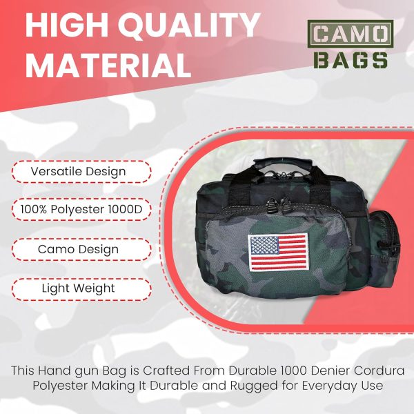 - WHAT YOU‘LL GET – Pistol case bag for handguns/pistols/revolvers (main pocket: L12”xW5“xH8“/). Extra accessories as showed in the main photo: #1- 1x Embroidered USA flag patch (3.1″x2.2″), #2- 1x Molle utility pouch with 2 vertical snap strap (L5“xW2.5“xH6″), #3- 1x Hand Gun Universal Holster that fits most popular pistol sizes (designed to carry a pistol in tactical bag backpack with loop panel)