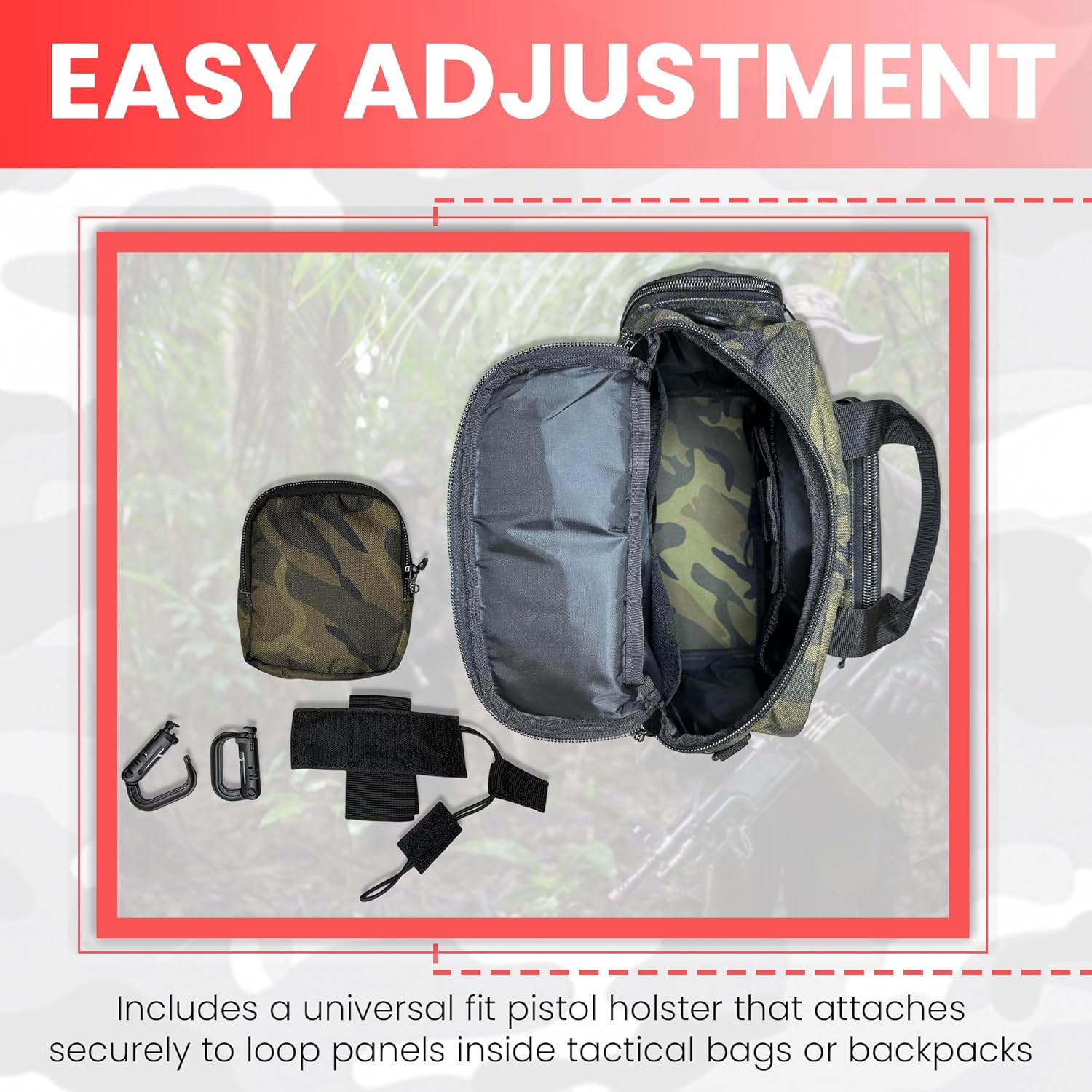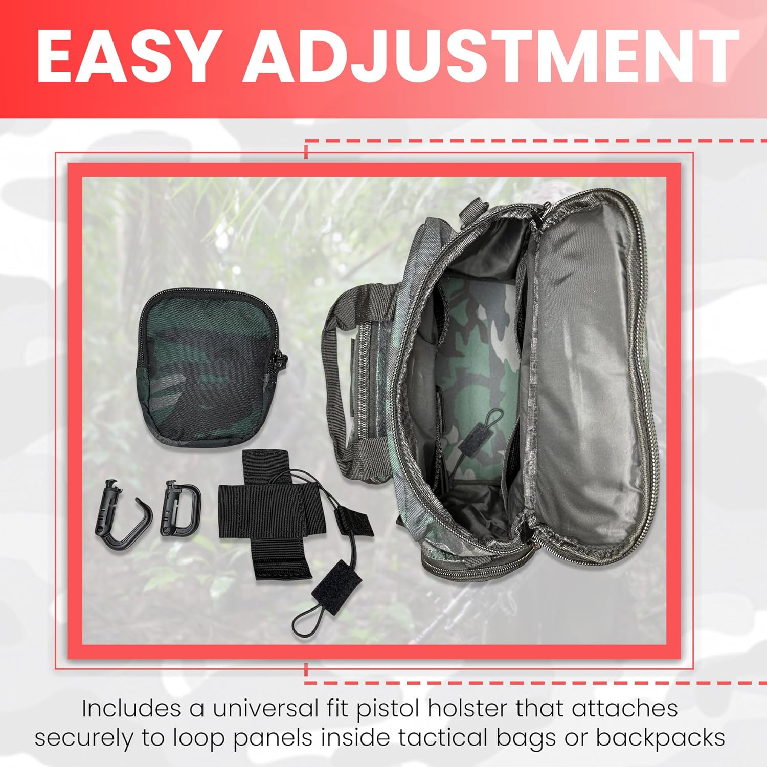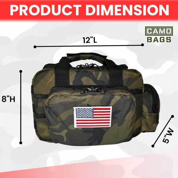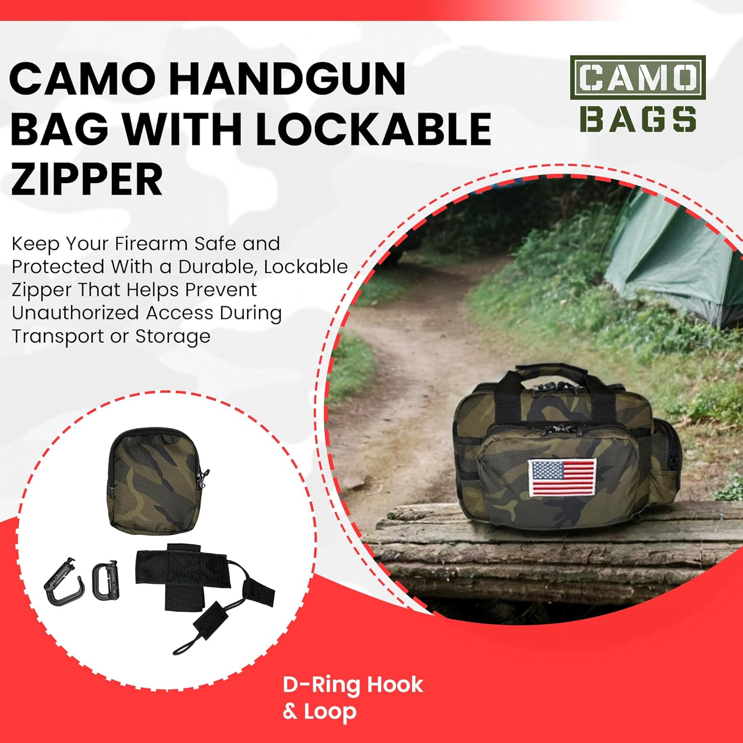 - WHAT YOU‘LL GET – Pistol case bag for handguns/pistols/revolvers (main pocket: L12”xW5“xH8“/). Extra accessories as showed in the main photo: #1- 1x Embroidered USA flag patch (3.1″x2.2″), #2- 1x Molle utility pouch with 2 vertical snap strap (L5“xW2.5“xH6″), #3- 1x Hand Gun Universal Holster that fits most popular pistol sizes (designed to carry a pistol in tactical bag backpack with loop panel)