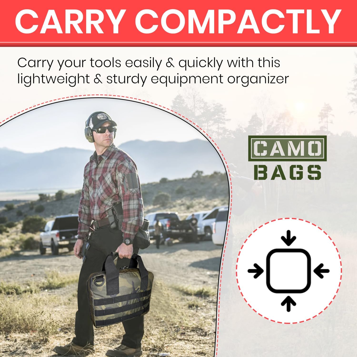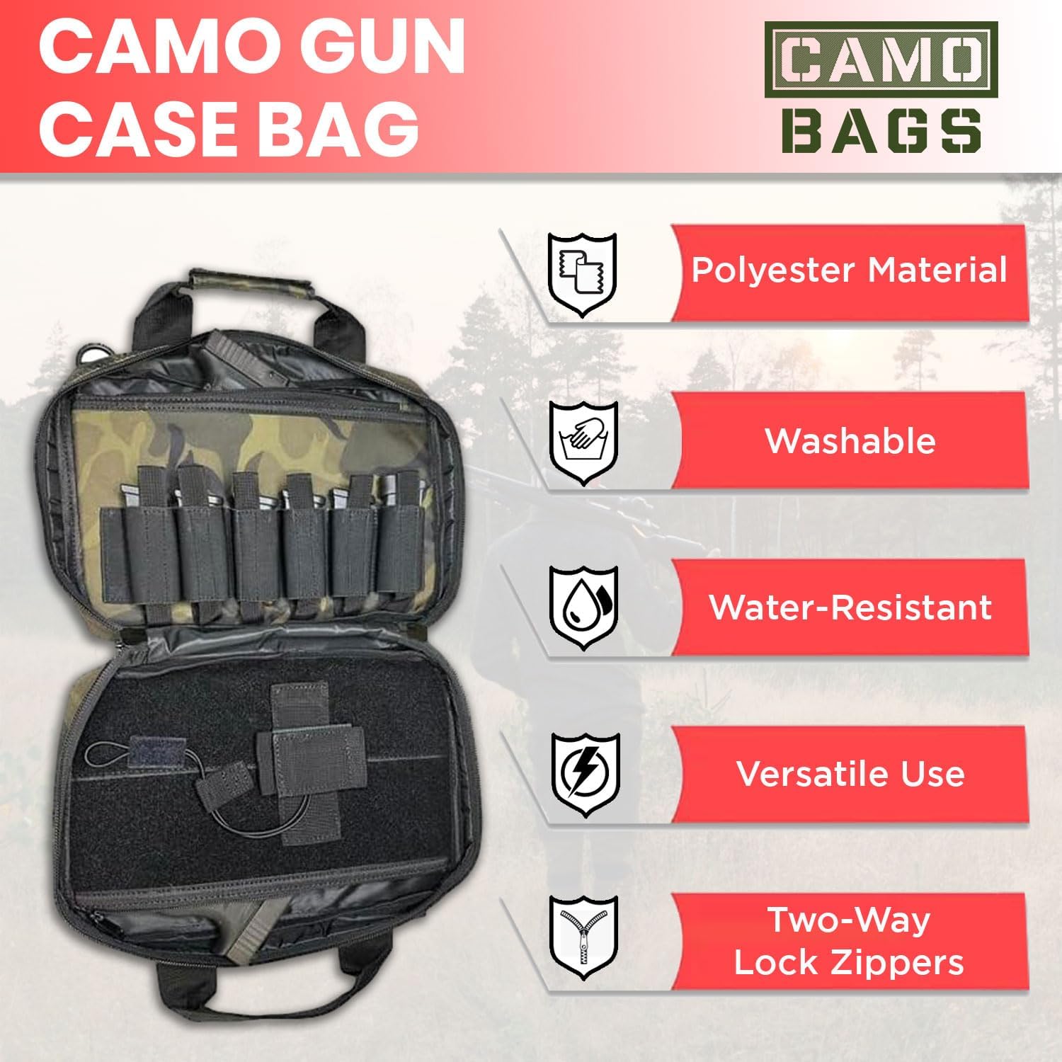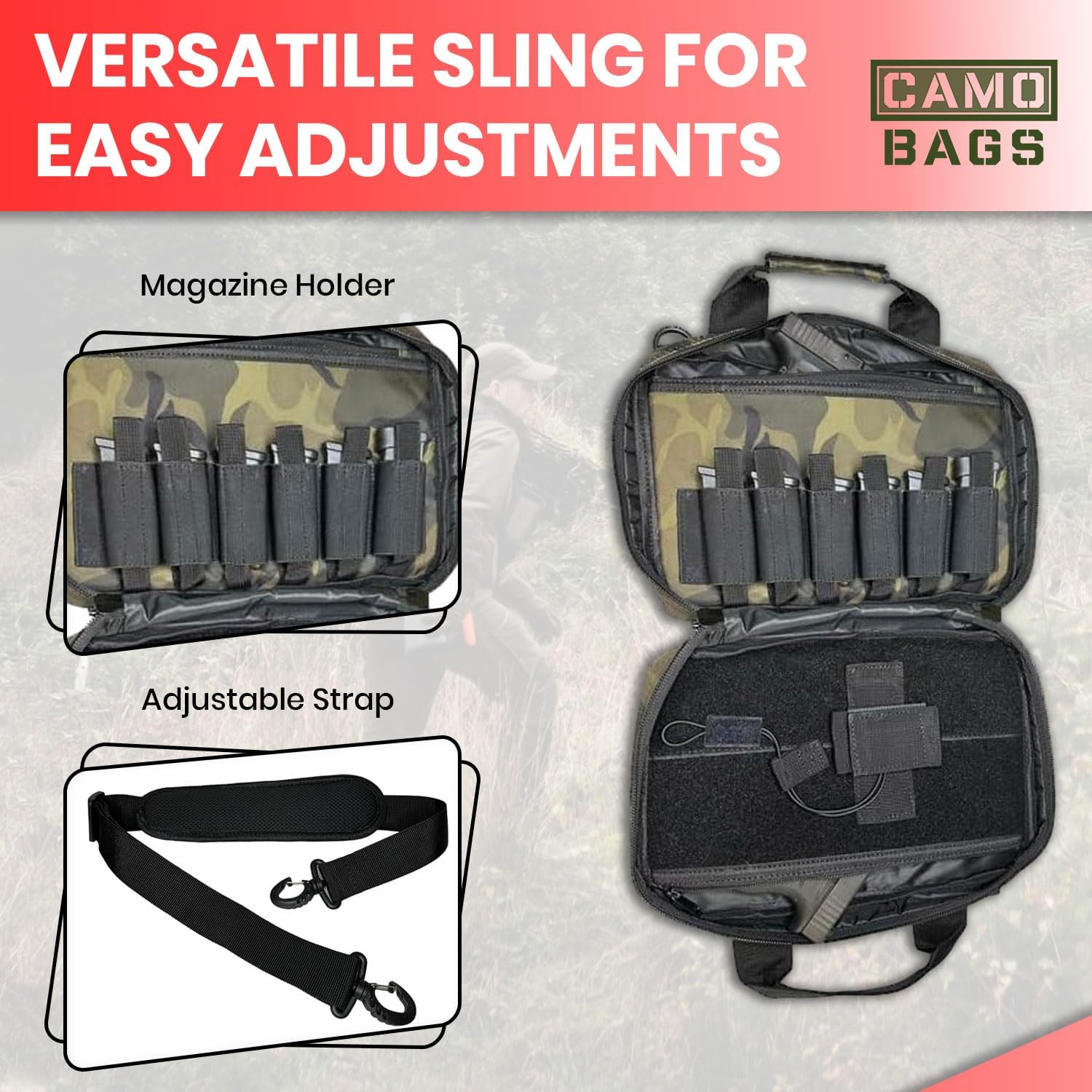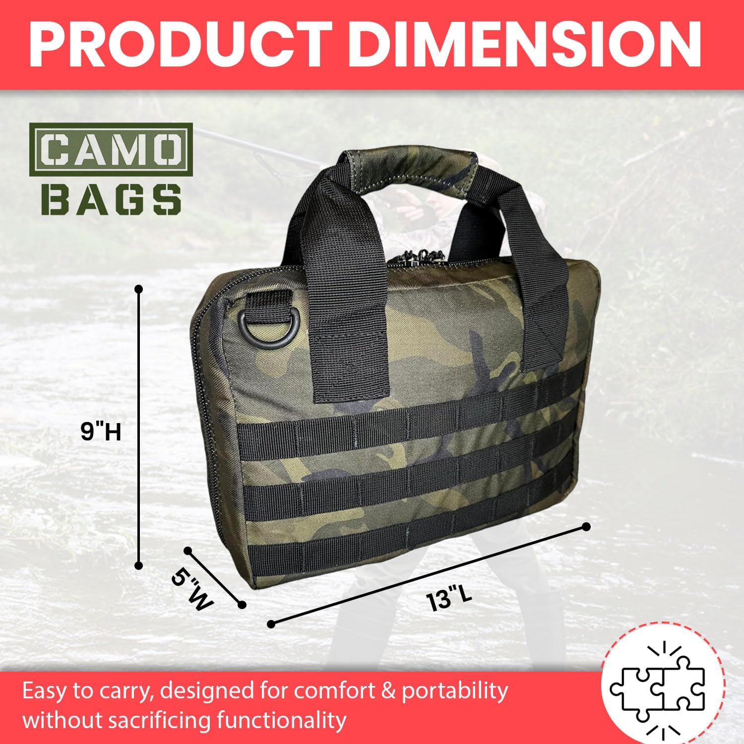 - ✔ STYLISH & FUNCTION – This gun carrying case for pistols features Molle webbing strap on the front and the rear. Interior whole loop panel is perfect for extra attaching of your small gear. It is also ideally used as tablet bag and multi-purpose bag for varied activities
