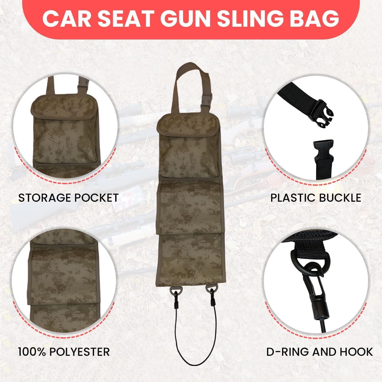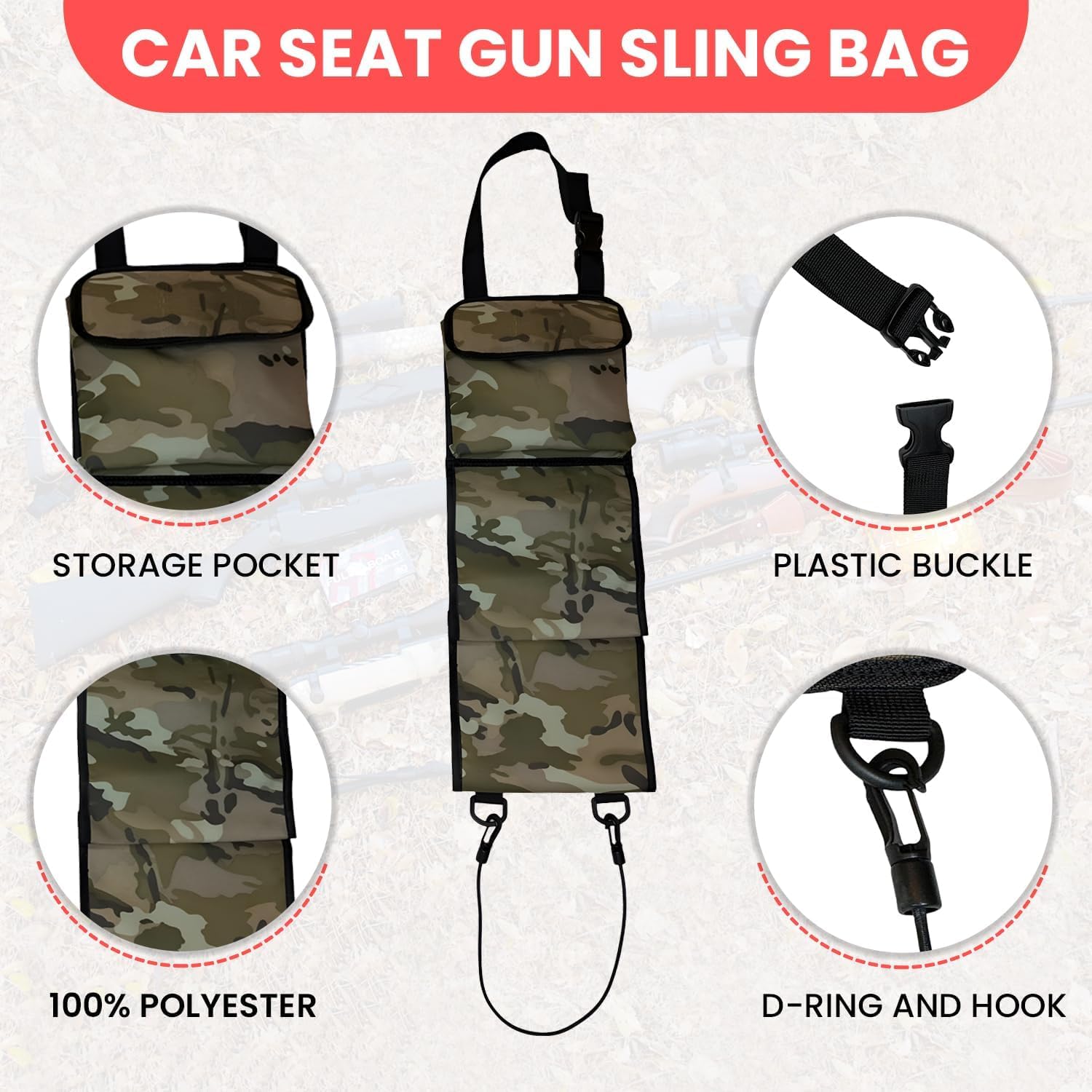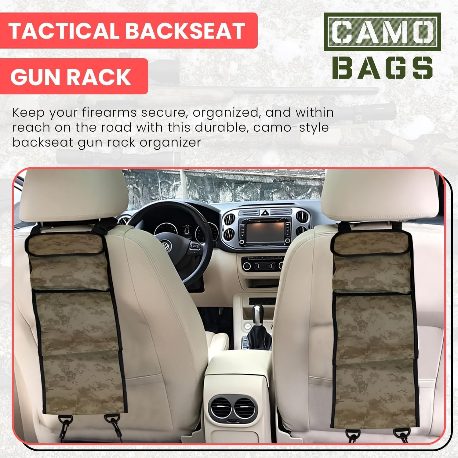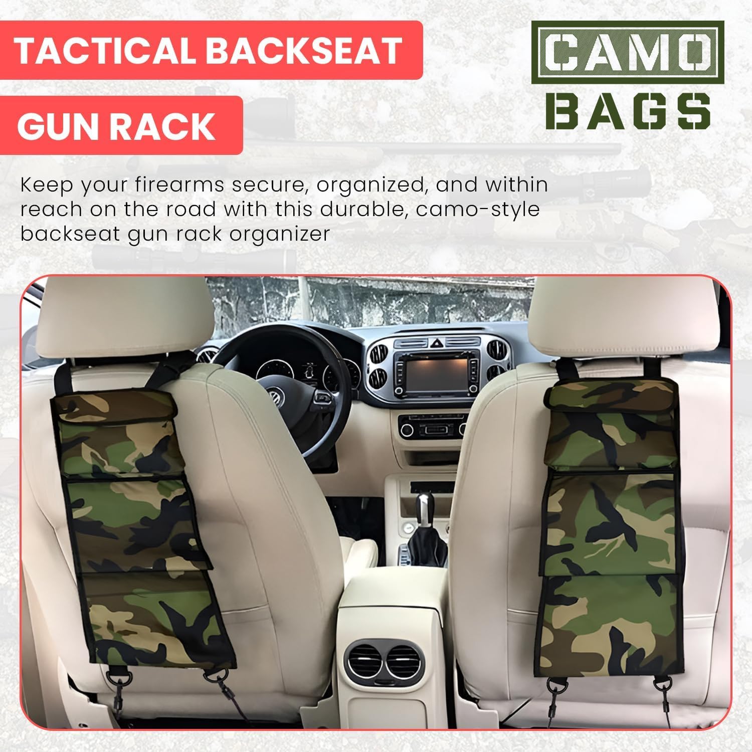 Each sling organizer rack has a storage pockets and 2 hanging baskets for rifles.