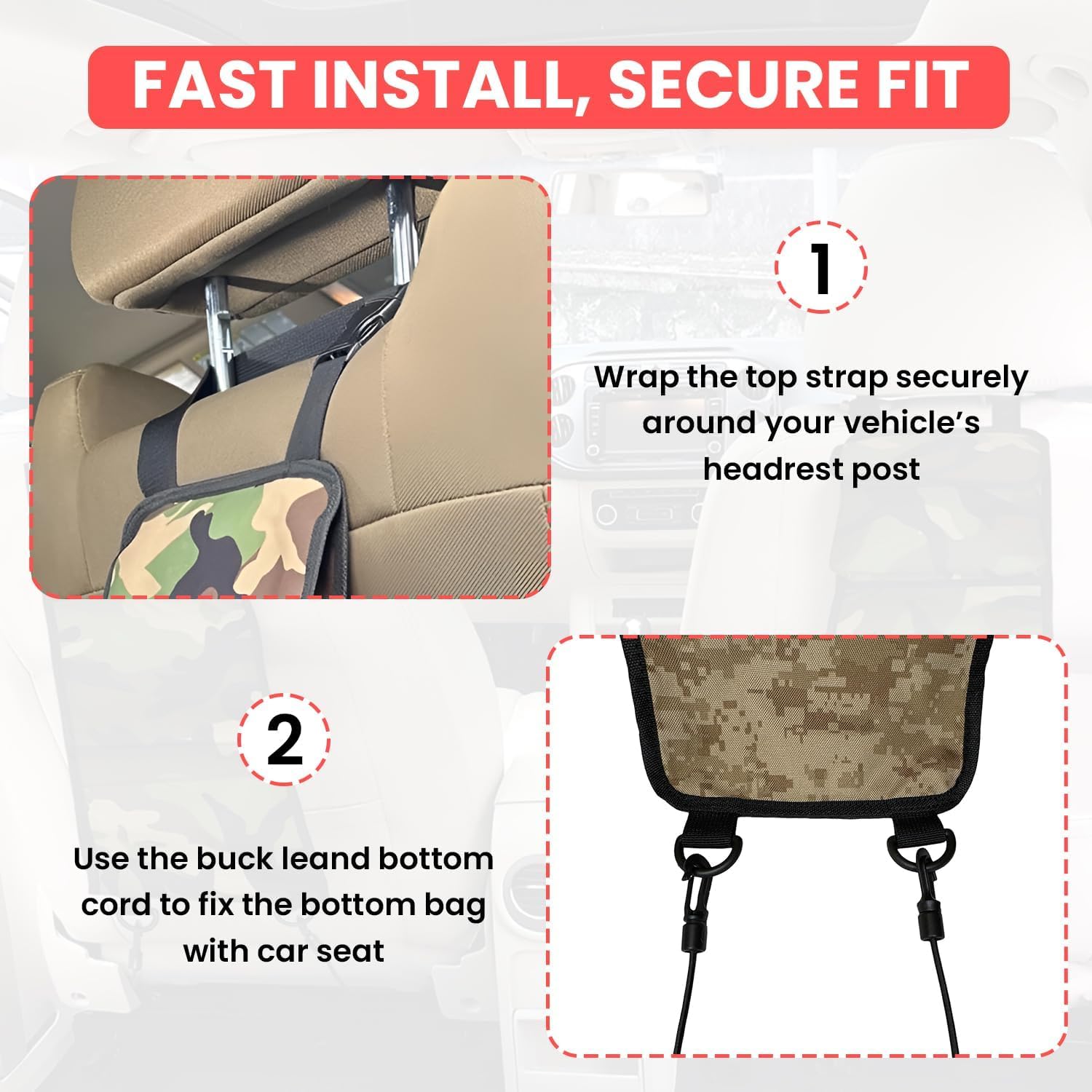 Easy To Install. Just hang the straps across the headrests.