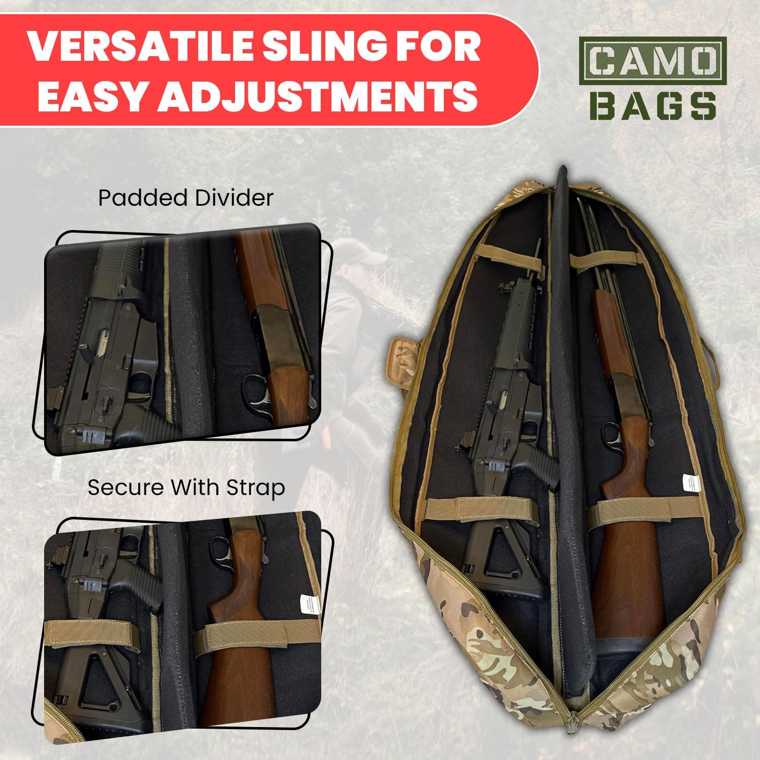 Holds 1 or 2 Rifles: Interior removable divider enables the carrying of one or two rifles with adjustable strap to secure your guns stay in place. NOTE: it’s suggested to remove the gun accessories if you want to hold 2 rifles.