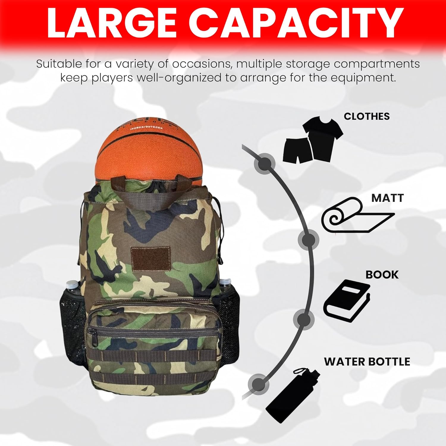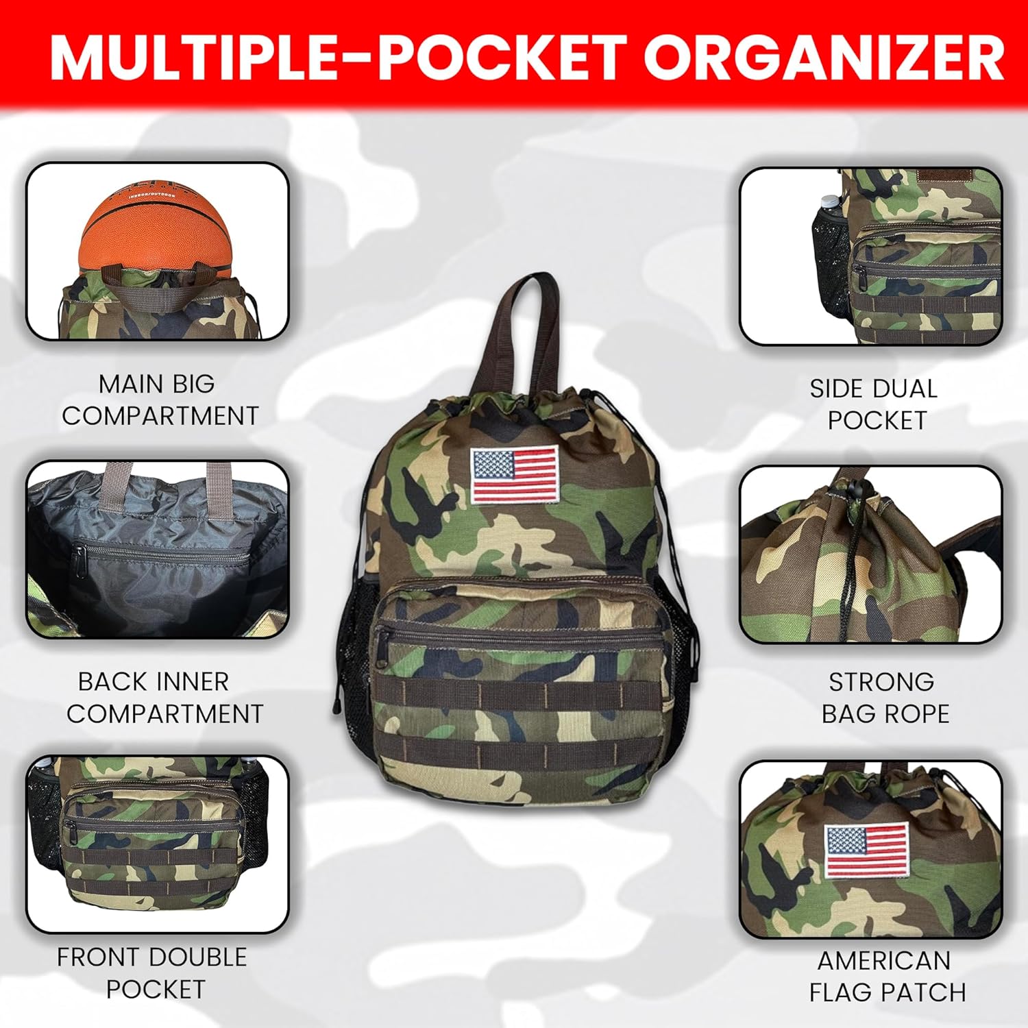 - Tactical Drawstring soccer bag pack measures 13.5” X 6” X 19″, which is lightweight and big enough to hold a basketball, soccer, football, gym clothing, swim gear, sport towel, textbooks and daily supplies. Includes adjustable drawstring to close the bag and the padded shoulder straps can bear more weight and help reduce your shoulder burden.