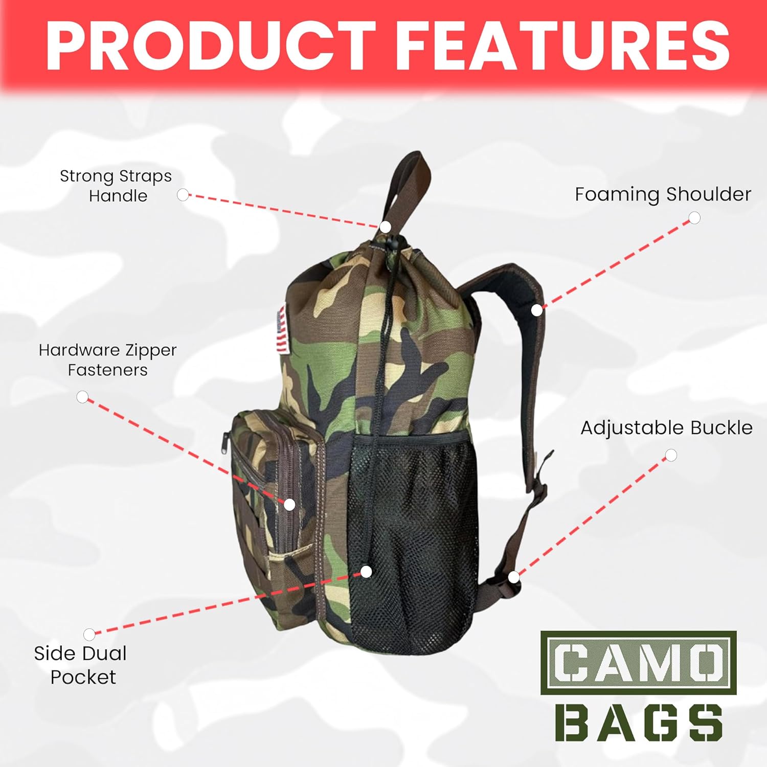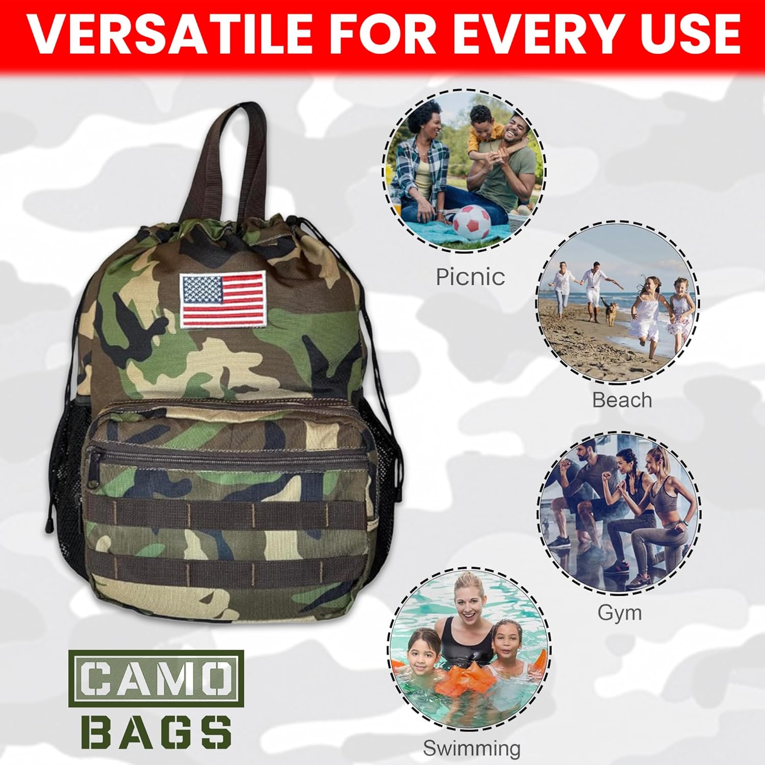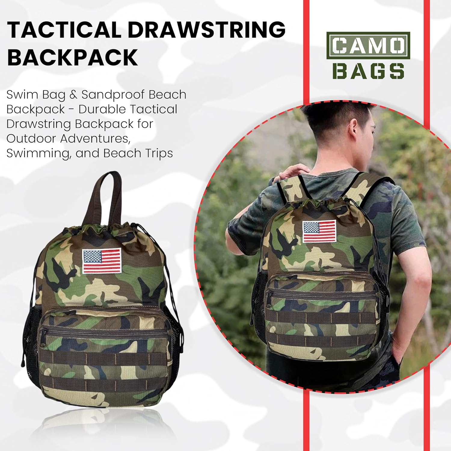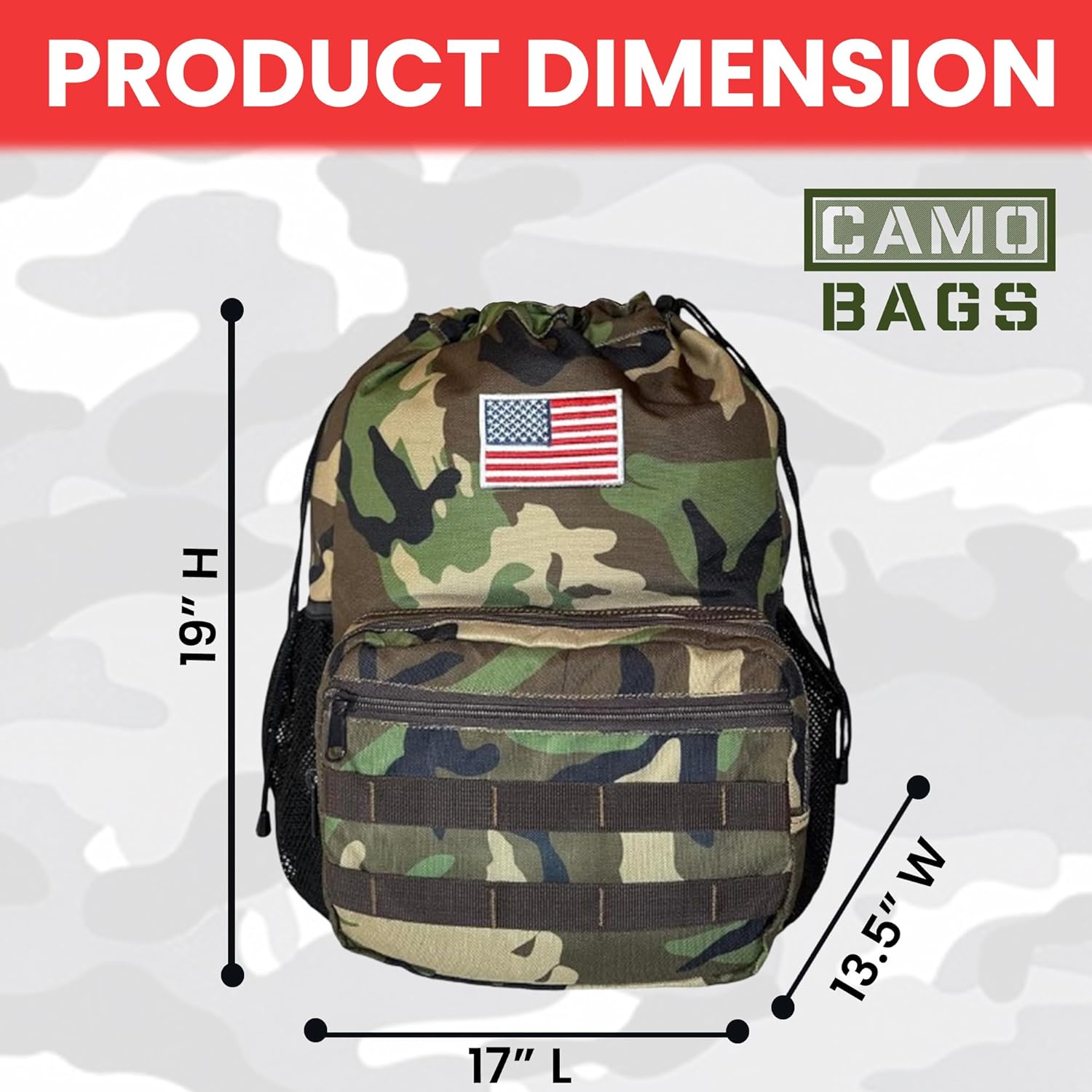 - Velcro patch in front for adding different patches to your liking. American Flag patch included.